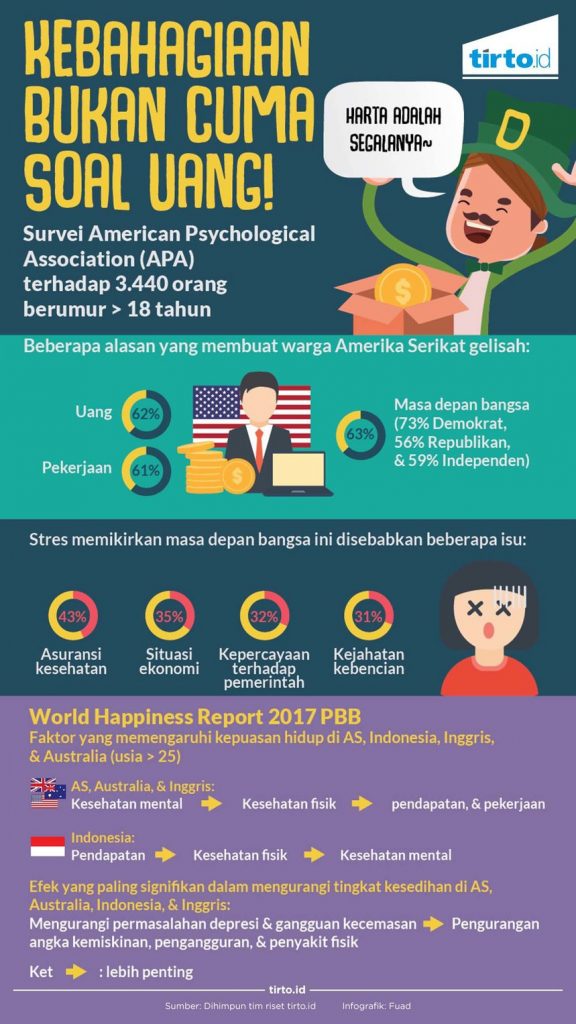 Laporan ini menemukan beberapa temuan menarik. Misalnya, Amerika Serikat yang tahun 2007, berada di peringkat ketiga dalam daftar negara paling bahagia turun ke peringkat 19. Penyebabnya adalah tergerusnya sistem penyokong kesejahteraan dan korupsi. Namun, menurut American Psychological Association (APA) berdasarkan survei online terhadap 3.440 orang berumur 18 tahun ke atas, ada banyak hal yang menyebabkan tingkat kebahagiaan orang Amerika Serikat turun. Misalnya, uang (62 persen) dan pekerjaan (61 persen) memang masih menjadi penyebab stres dan kegelisahan sehari-hari. Namun, 63 persen mempersoalkan masa depan bangsa sebagai alasan mereka tak begitu bahagia—pikiran penuh tekanan. Stres perihal masa depan bangsa ini dipicu oleh beberapa isu mulai dari asuransi kesehatan (43 persen), situasi ekonomi (35 persen), kepercayaan terhadap pemerintah (32 persen) sampai kejahatan kebencian (31 persen).