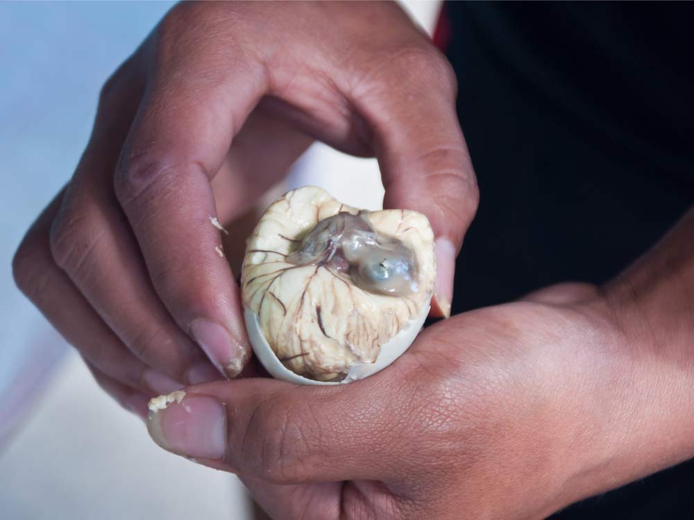 Telur adalah makanan umum di seluruh dunia tetapi di Filipina, mereka mengambilnya selangkah lebih maju dengan mengambil embrio bebek yang sedang berkembang dan kemudian merebusnya hidup-hidup ketika masih dalam cangkang. Biasanya dimakan dengan sedikit bumbu cabai, bawang putih dan cuka, semua isi telur dikonsumsi termasuk sayap dan paruh yang terlihat. Makanan jalanan yang umum, sering dikejar dengan bir dingin — cukup retak, menyeruput, dan menggigit.