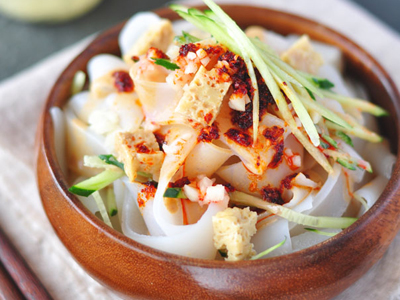 Mie dingin dan tebal dicampur dengan irisan mentimun segar, kacang renyah, dan gluten yang kenyal, ditambah dengan bawang putih, saus sambal, dan cuka untuk hidangan musim panas klasik dari Shaanxi yang penuh dengan rasa. Bagian yang sama pedas, asam, pedas dan menyegarkan, “kulit” sebenarnya terbuat dari tepung gandum atau beras yang dikukus sebelum dicincang menjadi “mie”.