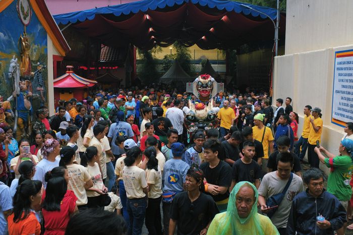 Beberapa umat Konghucu tampak meminta berkah saat rupang Toa Pek Kong berhenti. “Minta berkah pada Kongco (leluhur, red.),” bisik seorang perempuan paruh baya yang tengah berdoa.