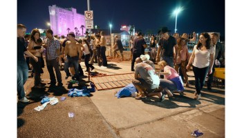 LAS VEGAS, NV - OCTOBER 01: People tend to the wounded outside the Route 91 Harvest Country music festival grounds after an apparent shooting on October 1, 2017 in Las Vegas, Nevada. There are reports of an active shooter around the Mandalay Bay Resort and Casino. (Photo by David Becker/Getty Images)
