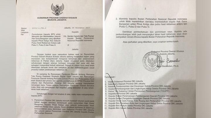 Surat tertanggal 29 Desember 2017 dengan nomor 2373/-1.794.2 itu bertanda tangan Anies Baswedan. Dalam surat itu tercantum Pemerintah Provinsi DKI Jakarta sedang melakukan kajian yang mendalam dan komprehensif mengenai kebijakan dan pelaksanaan reklamasi di pantai utara Jakarta.