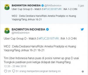 Tim Indonesia untuk Uber Cup harus mengakui kemenangan Tiongkok setelah pertandingan ganda putri Indonesia keempat, Della Destiara Haris / Rizki Amelia Pradipta, kalah dari Huang Yaqiong / Tang Jinhua di pertandingan final Grup D Uber Cup 2018, Rabu (23/5). Dalam pertandingan yang berlangsung di Impact Arena, Bangkok, Thailand, Della / Rizki kalah 21-16 dan 21-16.