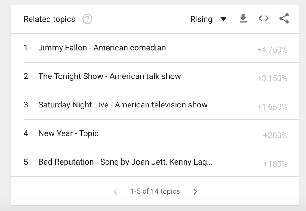 Google mengambil contoh hasil pencarian terhadap Tayor Swift. Saat kamu mengetik namanya di mesin pencarian google, coba kamu memperhatikan ada judul tambahan yang muncul dalam hasil pencarian yang dilist, dan “penyanyi dan penulis lagu amerika” adalah kata kunci yang kamu cari. Saat kamu meng-klik pencarian itu, kamu akan menemukan sebuah halaman yang menunjukkan hasil pencarian terhadap topik itu di Amerika selama seminggu belakangan. Jika kamu ingin mencari lebih dalam mengenai berita lama di internet, klik tombol di atas bagian kanan (akan merubah ke pengaturan awal ke ‘Web Search’) dan pilih Pencarian Gambar, Pencarian Berita, Google Shopping atau Pencarian Youtube. Selain itu, kamu juga bisa menemukan usulan ide dan topik lainnya yang sesuai dengan minat kamu.