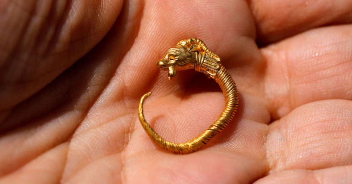 Di dekatnya, ekskavator juga menemukan manik emas dengan hiasan sulaman rumit yang menyerupai pola tali tipis, membagi manik-manik menjadi dua bagian dengan enam spiral di setiap sisi.