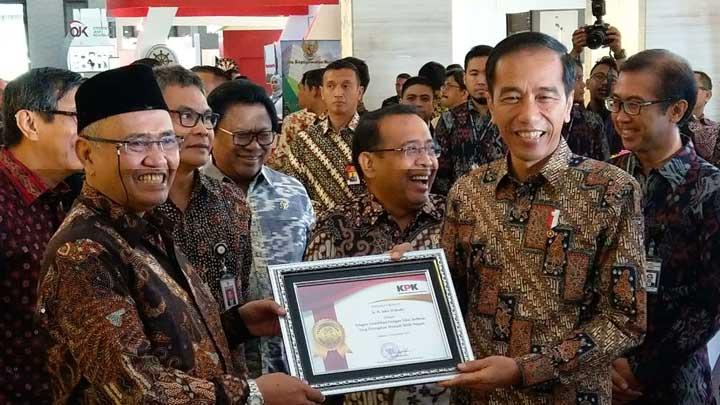 Jakarta – Ketua Komisi Pemberantasan Korupsi Agus Rahardjo memberikan penghargaan kepada Presiden Joko Widodo atau Jokowi pada perayaan Hari Antikorupsi se-Dunia di Hotel Bidakara, Jakarta, Senin 11 Desember 2017. Penghargaan yang diberikan adalah plakat gelar “Pelapor Gratifikasi dengan Nilai Terbesar yang Dijadikan Milik Negara”.