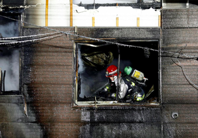 Penyiar umum NHK mengabarkan nyala api menelan bangunan bertingkat tiga yang dikelilingi tumpukan salju. Cuplikan udara dari Kamis pagi menunjukkan sisa-sisa bangunan rumah yang dihitamkan itu.
