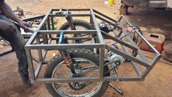 Buatan Chris ini merupakan kendaraan beroda empat dengan kerangka luar, terinspirasi ide kendaraan “PUG off-road” yang sudah ada sejak 1960an.