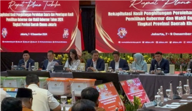 “Dengan mengucap Bismillahirrahmanirrahim, berita acara sertifikasi rekapitulasi hasil penghitungan perolehan suara dari setiap kabupaten/kota dalam pemilihan gubernur dan wakil gubernur DKJ 2024, saya nyatakan sah,” kata Ketua KPU Provinsi DKI Jakarta Wahyu Dinata dalam rapat pleno Penetapan Hasil Pemilihan Gubernur DKI Jakarta 2024, Minggu.
