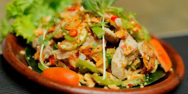 Lalu disiram dengan sambal matah layaknya dressing salad, yang terbuat dari kecombrang, bawang merah, dan potongan cabai. Terakhir, taburan kacang tanah sangrai menambah sensasi garing pada salad ini.