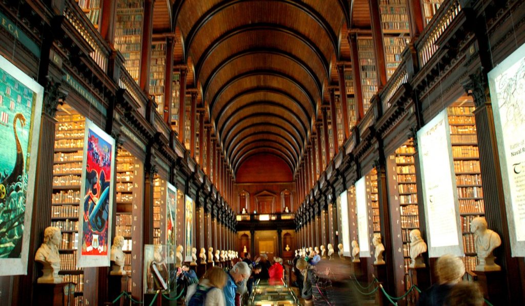 Tingkatkan permainan Anda di perpustakaan Trinity College, perpustakaan penelitian terbesar di Irlandia. Sebagai perpustakaan deposito resmi, secara legal berhak atas salinan setiap buku yang diterbitkan di Inggris dan Irlandia, mencatat volume enam juta bahan cetak yang mengejutkan termasuk koleksi manuskrip, skor musik dan peta yang luas.