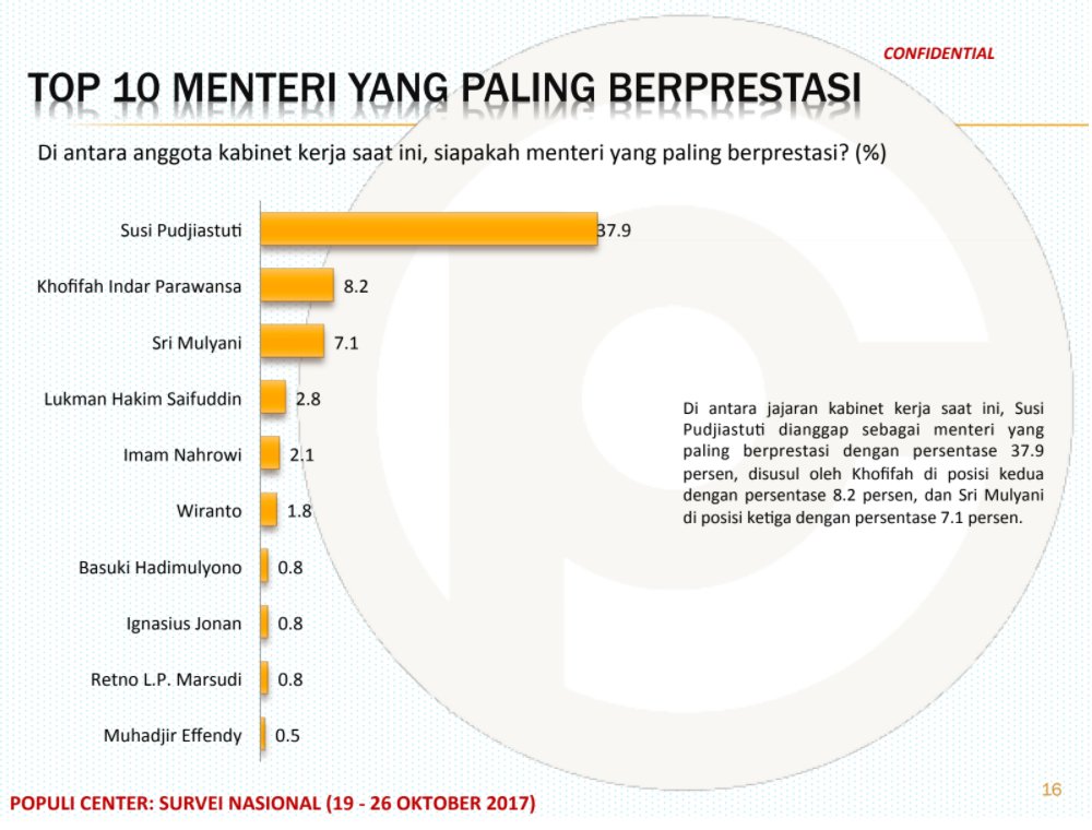 Berdasarkan survei Populi Center, Menteri Kelautan dan Perikanan Susi Pudjiastuti menempati posisi pertama dengan 37,9 persen.