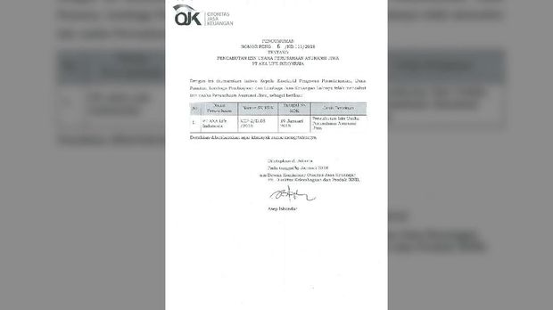 Surat pencabutan izin ditetapkan atas persetujuan Anggota DK OJK sekaligus Kepala Eksekutif Pengawas Industri Keuangan Non Bank (IKNB) Riswinandi dan Pelaksana Tugas (Plt) Direktur Kelembagaan dan Produk IKNB OJK Asep Iskandar.