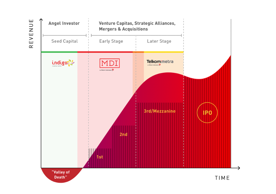 Untuk mengatasi dinamika yang tidak menyenangkan ini, kami menggabungkan dua inkubator digital besar di Indonesia: Indigo Creative Nation Mandiri Indonesia dan Mandiri Digital Inkubator Bank Mandiri. Gagasan dengan para pemula bahwa kami ingin membantu para pemula yang telah meningkatkan pertama mereka. Agar kedua program ini berhasil, mereka perlu membantu kohort startup untuk mendapatkan putaran pendanaan di masa depan dari investor baru dan membantu mereka mengikuti target pertumbuhan mereka.