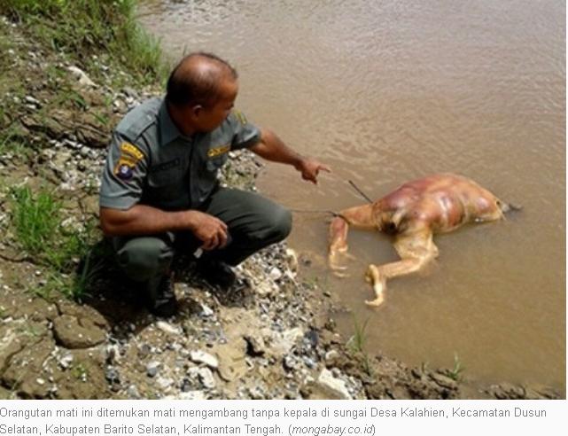Seorang warga Desa Kalahien, Kecamatan Dusun Selatan, Kabupaten Barito Selatan, Kalimantan Tengah, menemukan bangkai orangutan mengambang di sungai. Ia yang tinggal di atas rumah apung, biasa disebut rumah lanting, Senin (15/01/2018) pagi, kaget melihat sosok mayat yang tersangkut itu. Segera, ia melapor temuannya ke kepolisian setempat.