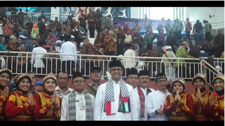 Jakarta. Gubernur DKI Jakarta Anies Baswedan mengenakan syal berlogo bendera Indonesia-Palestina saat kunjungan kerja (kunker) ke Kota Administrasi Jakarta Timur. Dalam sambutannya, Anies bercerita mengenai syal tersebut. Dia mengatakan, hal itu sebagai bukti penolakan terhadap pengakuan sepihak Amerika Serikat terhadap Yerusalem sebagai ibu kota Israel.