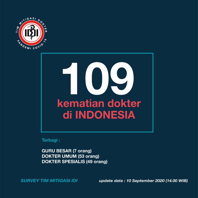 Dari 109 orang dokter yang dinyatakan meninggal, sebanyak 49 orang adalah dokter spesialis, 53 orang merupakan dokter umum dan 7 orang merupakan Guru Besar.