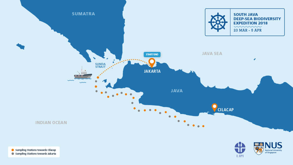 Tiga puluh satu ilmuwan dan 25 anggota awak pendukung berangkat ke kapal penelitian Indonesia, Baruna Jaya VIII, pada 23 Maret dari Jakarta. Mereka berlayar berlawanan arah jarum jam menuju Cilacap di selatan Jawa dan kembali, mengambil sampel pada kedalaman rata-rata 800 m dan hingga 2.100 m.