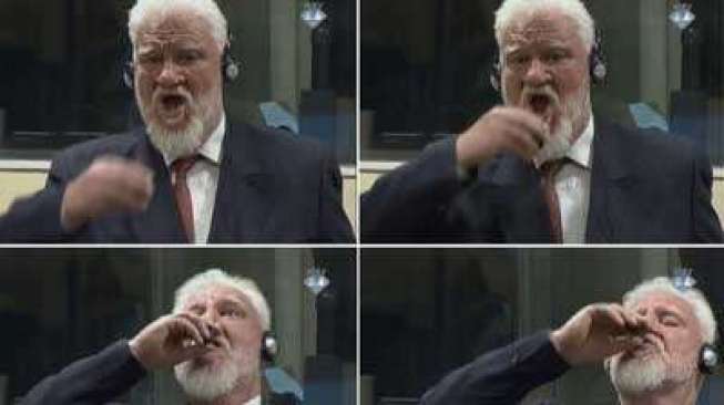 Slobodan Praljak, komandan pasukan etnis Bosnia Kroasia selama Perang Bosnia 1992-1995, nekat meminum racun saat disidang dalam dalam pengadilan penjahat perang Yugoslavia yang diinisiasi PBB di Hague, Belanda.
