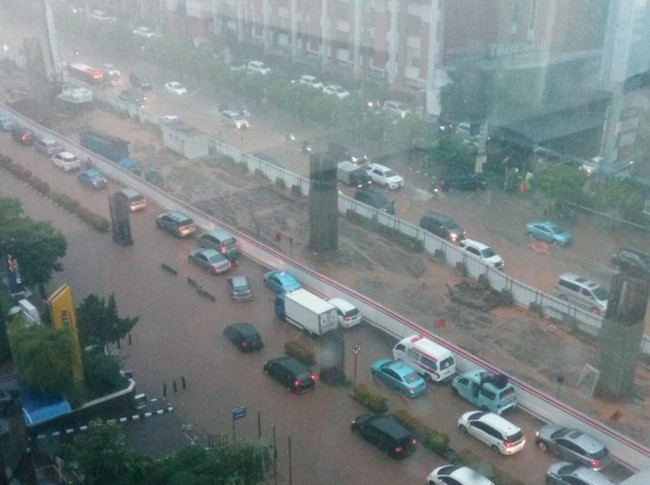 Hujan deras yang mengguyur Jakarta dan sekitarnya, menyebabkan sebagian jalan tergenang air. Genangan air merendam kawasan Kuningan, Jakarta Selatan.