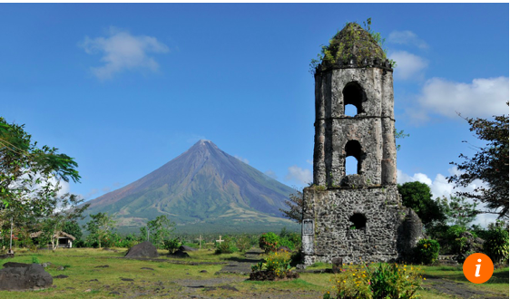 Perban sebuah gereja Cagsawa menonjol dari tanah sebagai pengingat kemarahan mematikan Mayon yang telah menjadi objek wisata.