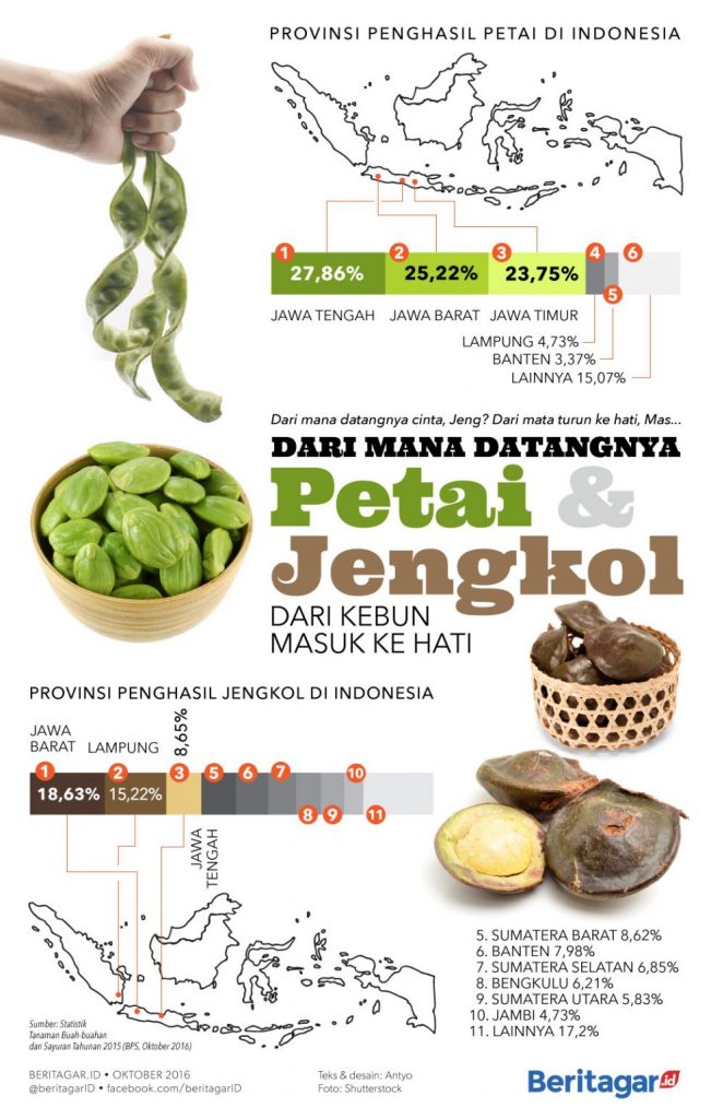 Asam di gunung, garam di laut. Petai di Jawa Tengah, jengkol di Jawa Barat. Dari sejumlah provinsi penghasil petai pada 2015, yang terbesar adalah Jateng (72.757 ton atau 27,86 persen nasional).