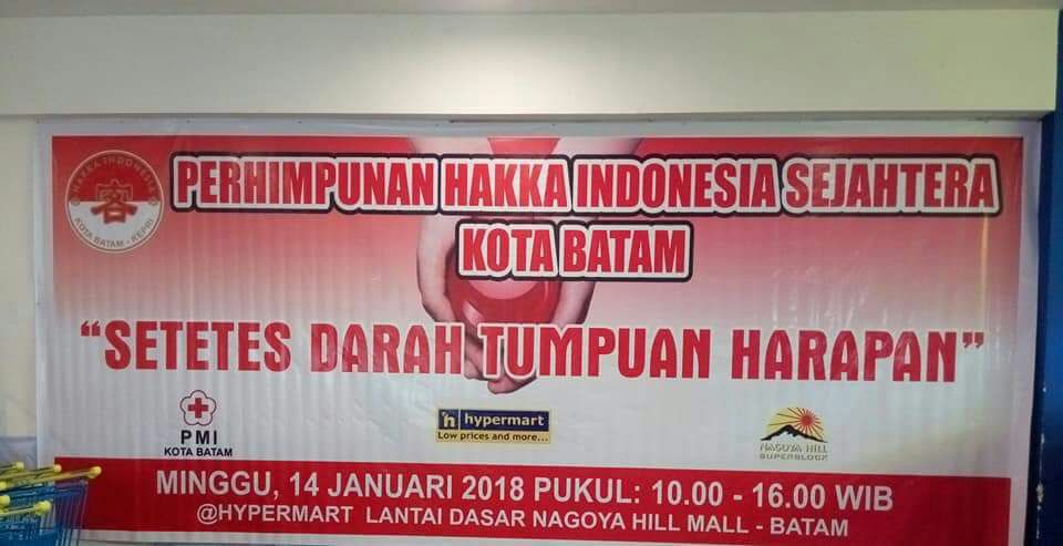 Perhimpunan Hakka Indonesia Sejahtera Kota Batam kembali menggelar kegiatan donor darah. Kegiatan ini dilakukan pada hari minggu, 14 Januari 2018 di Hypermart Nagoya Hill Mall, Kota Batam. Baksos donor darah mengangkat tema “Donor Darah: Setetes Darah Tumpuan Harapan”.