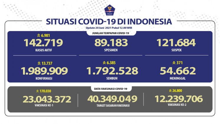 Jakarta – Pasien terkonfirmasi positif Covid-19 di Indonesia yang tercatat hingga Minggu 20 Juni 2021 telah mencapai 1.989.909 atau nyaris 2 juta kasus.