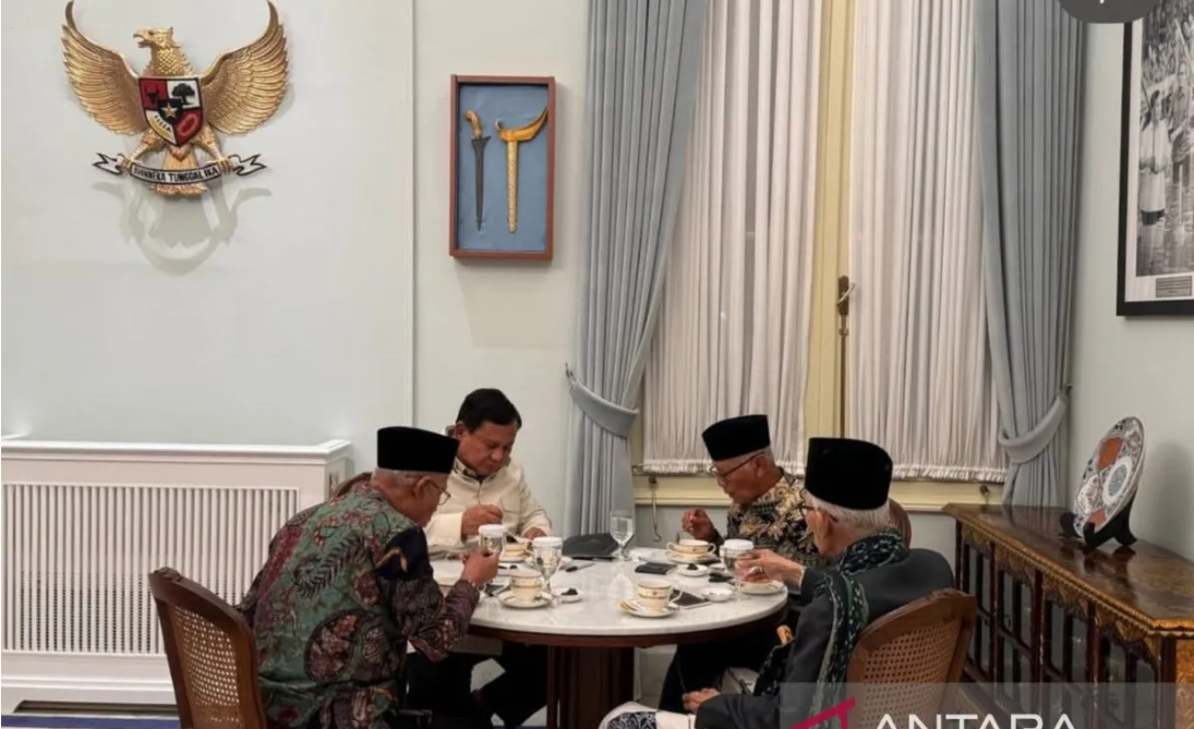 Jakarta – Presiden Prabowo Subianto membagikan momen berbuka puasa bersama Rais Aam Pengurus Besar Nahdlatul Ulama (PBNU) KH Miftachul Akhyar, Ketua Umum (Ketum) Muhammadiyah Prof. Haedar Nashir, dan Ketua Umum Majelis Ulama Indonesia (MUI) KH Anwar Iskandar di Istana Merdeka, Jakarta, Kamis.