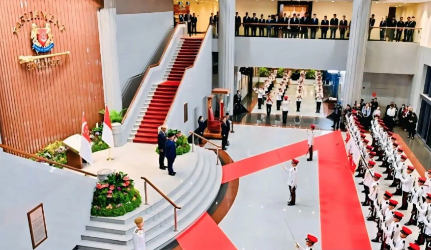 Setibanya di lokasi, Presiden Prabowo dan Presiden Tharman berjalan berdampingan melewati karpet merah menuju Saluting Dais, tempat utama upacara kenegaraan berlangsung.