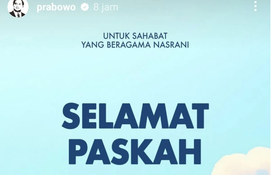 Jakarta – Presiden RI Prabowo Subianto menyampaikan ucapan Selamat Hari Paskah 2025 kepada seluruh umat Kristiani di Indonesia melalui akun Instagram @presidenrepublikindonesia, di Jakarta, Minggu.
