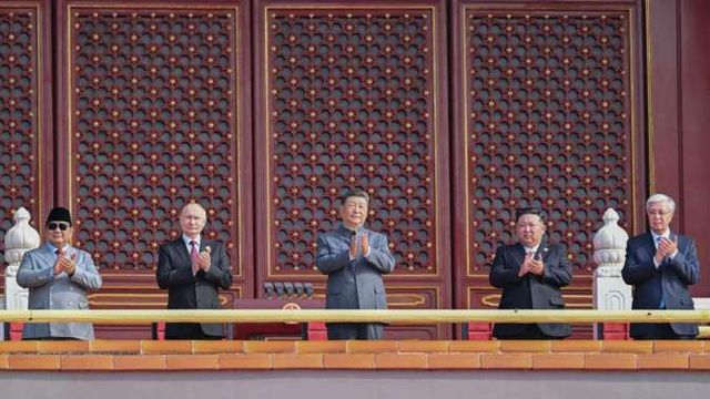 Di layar besar di Lapangan Tiananmen, terlihat Presiden Xi Jinping, Pemimpin Besar Korea Utara dan Presiden Rusia Vladimir Putin akrab berbincang satu sama lain.