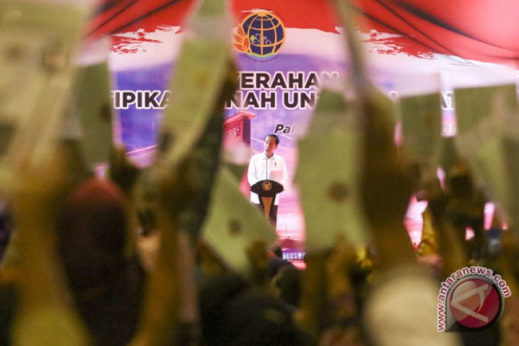 Presiden Joko Widodo berpidato di hadapan ribuan penerima sertifikat tanah untuk rakyat di Palembang Sport and Convention Center (PSCC) Palembang, Sumatera Selatan, Senin (22/1/2018). Presiden Joko Widodo, menyerahkan 5.534 sertifikat hak atas tanah milik warga yang berada di daerah Provinsi Sumatera Selatan, serta menargetkan tujuh juta sertifikat tanah dikeluarkan oleh Badan Pertanahan Nasional (BPN) pada tahun 2018. (ANTARA /Nova Wahyudi)