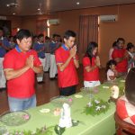 Sedangkan relawan barisan kedua dari setiap persegi mempersembahkan bunga. Setelah mempersembahkan lilin, air, dan bunga, para relawan mengarahkan peserta memandikan rupang Buddha.