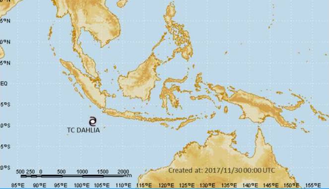 Siklon tropis Dahlia pertama kali terpantau pada Rabu, 29 November 2017 di sebelah barat daya Bengkulu. Siklon ini menjadi pemicu sejumlah kejadian seperti angin kencang, gelombang tinggi, hujan lebat dan petir.