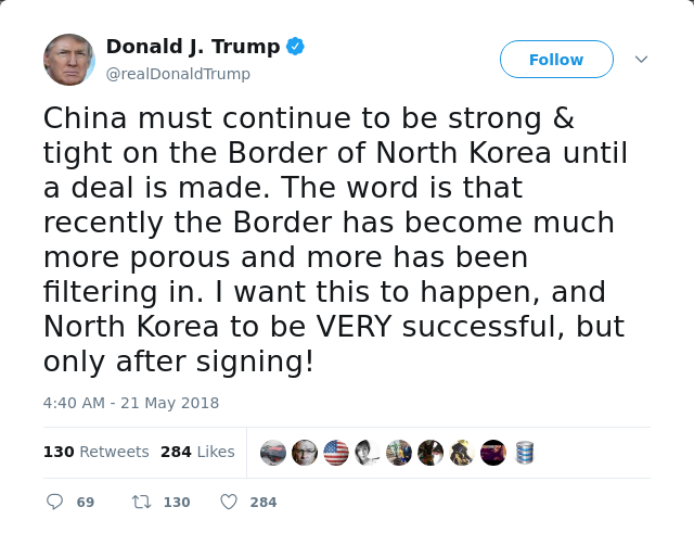 “China harus terus menjadi kuat & ketat di Perbatasan Korea Utara sampai kesepakatan dibuat. Kabarnya, akhir-akhir ini Perbatasan menjadi lebih berpori dan lebih banyak lagi penyaringan. Saya ingin ini terjadi, dan Korea Utara menjadi SANGAT sukses, tetapi hanya setelah penandatanganan! ” ungkap Trump melalui cuitannya di twitter.