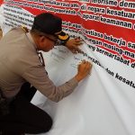 Diakhir kegiatan, seluruh komponen membubuhkan tanda tangan di atas baliho sebagai aksi penolakan dan pemberantasan terhadap tindakan terorisme dan radikalisme. (Rio Dharmawan)
