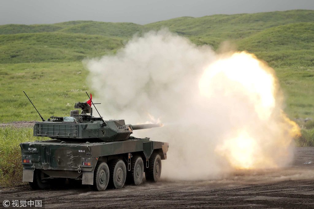 Pasukan Bela Diri Darat Jepang (JGSDF) Tipe 16 kendaraan tempur mobil menembakkan amunisi selama latihan kebakaran langsung di kaki Gunung Fuji di distrik Hataoka Area Manuver Fuji Timur di Gotemba, Prefektur Shizuoka, Jepang, pada hari Sabtu, Agustus 25, 2018. / Foto VCG