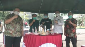Alim Markus didampingi Arif Harsono, Liem Ou Yen dan pengusaha lainnya menyerahkan uang tunai tersebut secara simbolis yang diterima Pangdam V Brawijaya Mayjend TNI Suharyanto, di lapangan Kodam V Brawijaya, Rabu (20/1/2021).